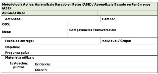 Las fichas contienen información sobre cada una de las actividades que demanda la situación de aprendizaje implantada; así, el alumnado es consciente de la metodología activa concreta que utilizará, del tiempo que le dedicará, de los ODS, las metas y las competencias transversales que trabajará, del objetivo que tiene esa actividad, etc. Para facilitar la labor al alumnado, los docentes marcan la fecha de entrega de la actividad y si se la realizará de manera individual o grupal, definen una pregunta guía que sirva de orientación y ponen a disposición del alumnado el material necesario para elaborar la actividad. En la misma ficha, se especifica el peso de cada actividad en la evaluación, así como la evidencia para evaluarla y los criterios que se aplicarán para ello.