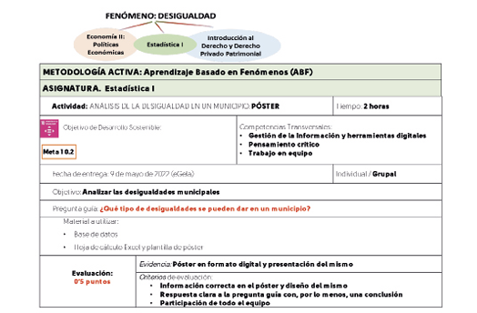 El fenómeno de la desigualdad se analiza desde las tres asignaturas, y a lo largo de todo el semestre se van coordinando las actividades entre los equipos docentes (Barandiaran et al., 2021). Se funciona como en una especie de “Estado federal” en el que se establecen criterios comunes, pero contando con cierta autonomía. En total se realizan siete actividades en Economía II, dos en Estadística I, y una en Introducción al Derecho. Un resumen de las actividades se muestra en la Tabla 1.