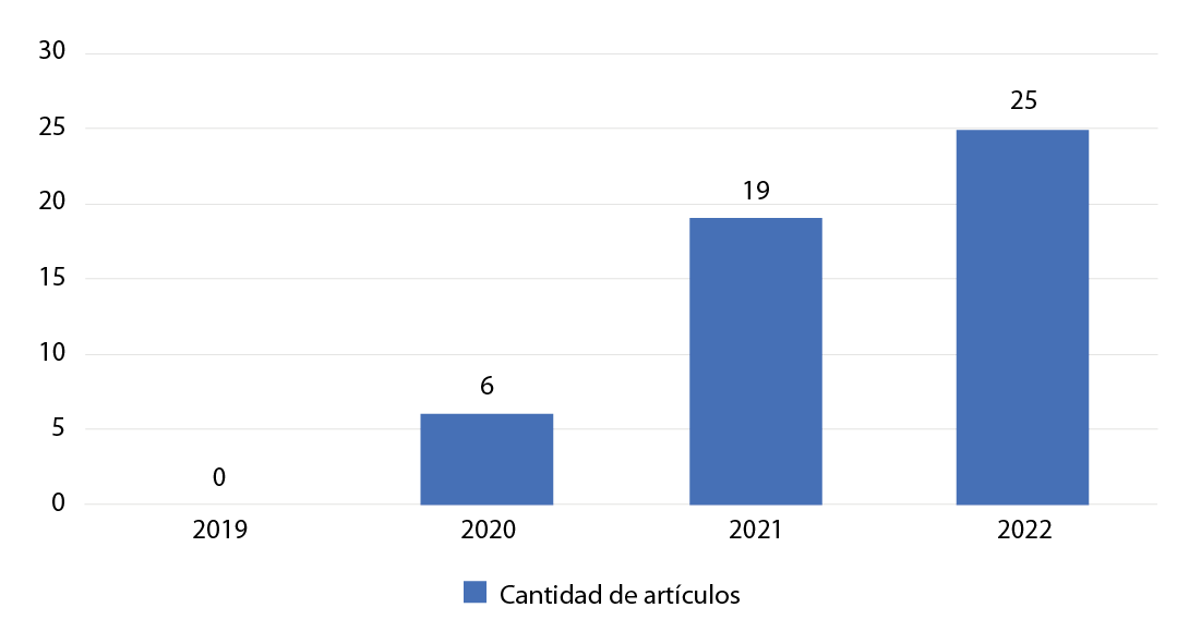 En la selección final no quedaron artículos de 2019, aunque dicho año fue considerado para la búsqueda inicial. Es posible afirmar que la muestra seleccionada se enfoca en estudios que fueron llevados a cabo durante la pandemia por COVID-19. La cantidad de artículos relevantes aumenta de manera constante, con la mayor cantidad presente en 2022, año en que se realizó esta investigación.