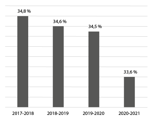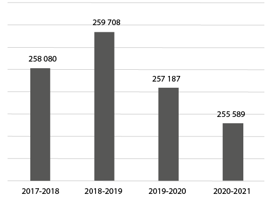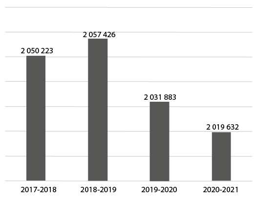 Por su parte, la Figura 2 muestra la disminución en el número de escuelas entre los períodos 2018-2019 y 2020-2021: 4119 centros educativos, equivalente al 1,6 %. Aquellos colegios que, por falta de recursos o redes de apoyo, no pudieron dar continuidad al servicio educativo dejaron de prestarlo de forma permanente, como afirma Ruiz (2020).