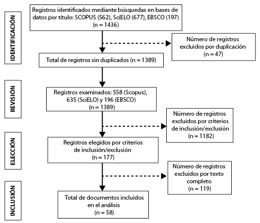 Una vez realizado el proceso a partir de los criterios de inclusión y exclusión definidos para el presente trabajo, quedaron seleccionadas 58 publicaciones. Dichas publicaciones fueron organizadas en una matriz de Excel para facilitar su análisis y clasificar su información más relevante. En primer lugar se observó que, dentro del grupo seleccionado, 35 artículos (60,4 %) fueron obtenidos de SciELO; 22 (37,9 %), de EBSCO; y solo uno (1,7 %), de ScienceDirect.