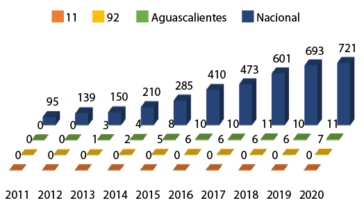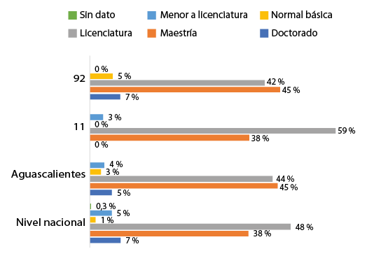Se puede apreciar que el 50 % de la planta docente en Aguascalientes tiene estudios de posgrado, por encima del indicador a nivel nacional (45 %). En una comparación entre las dos escuelas normales, se identifica que la 92 tiene el mayor número de profesores con posgrado, con un 52 % del total, mientras que en la 11 es de 38 %.