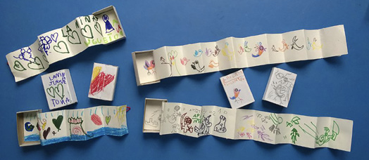Afterward, they were shown an example of a visual story created in a matchbox, resembling a small book, and the same image-reading exercise was repeated. Together, they came up with a title for that story. On the table, there were pencils and markers, sheets of white paper cut and folded to fit the size of the box, matchboxes covered with white adhesive paper, and glue sticks. Participants were then encouraged to create their own visual story. The creative activity focused on drawing and coloring the scenes of the story so that the matchbox would serve as the cover. To conclude the activity, the group sat in a circle, and each child took turns sharing their story for the others to read. An interesting aspect of this moment was that the children realized there wasn’t just one way to interpret their stories, and sometimes the story someone else read was different from the one they had drawn.