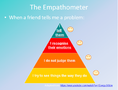 As an extension of this activity, the empathometer may be introduced as a useful tool to make students aware of and analyse their empathic reactions and choices in the classroom. The empathometer (see Fig. 4), which is based on the four characteristics of empathy according to Brené Brown, was designed by us. It can be put up on the wall and students can use stickers to measure their progress in empathy development. There is also the possibility that, depending on the age of the students, the empathometer may be designed by them.