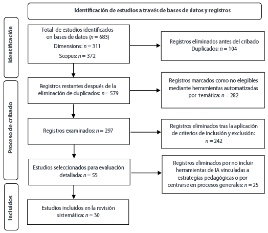 El proceso de selección de estudios se diseñó para ser alineado con el diagrama de flujo PRISMA (figura 2). Se identificaron 683 registros provenientes de Dimensions (n = 311) y Scopus (n = 372), y los duplicados (n = 104) se eliminaron con Mendeley, lo que resultó en 579 documentos únicos. El cribado inicial, asistido por un informe automatizado generado con ChatGPT-4o, permitió descartar una cantidad de registros (n = 282) que no cumplían con los criterios preliminares de relevancia: presentar una herramienta concreta de IA y su aplicación pedagógica. Este proceso fue validado mediante una revisión manual de títulos y resúmenes.