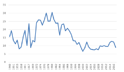 Gráfico 5.PGE-E (porcentaje), 1940-2017 (Bilbao, 1980; CSE, 2011; Pacheco, 1992).