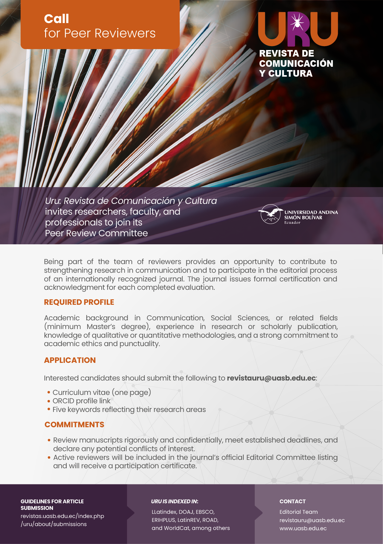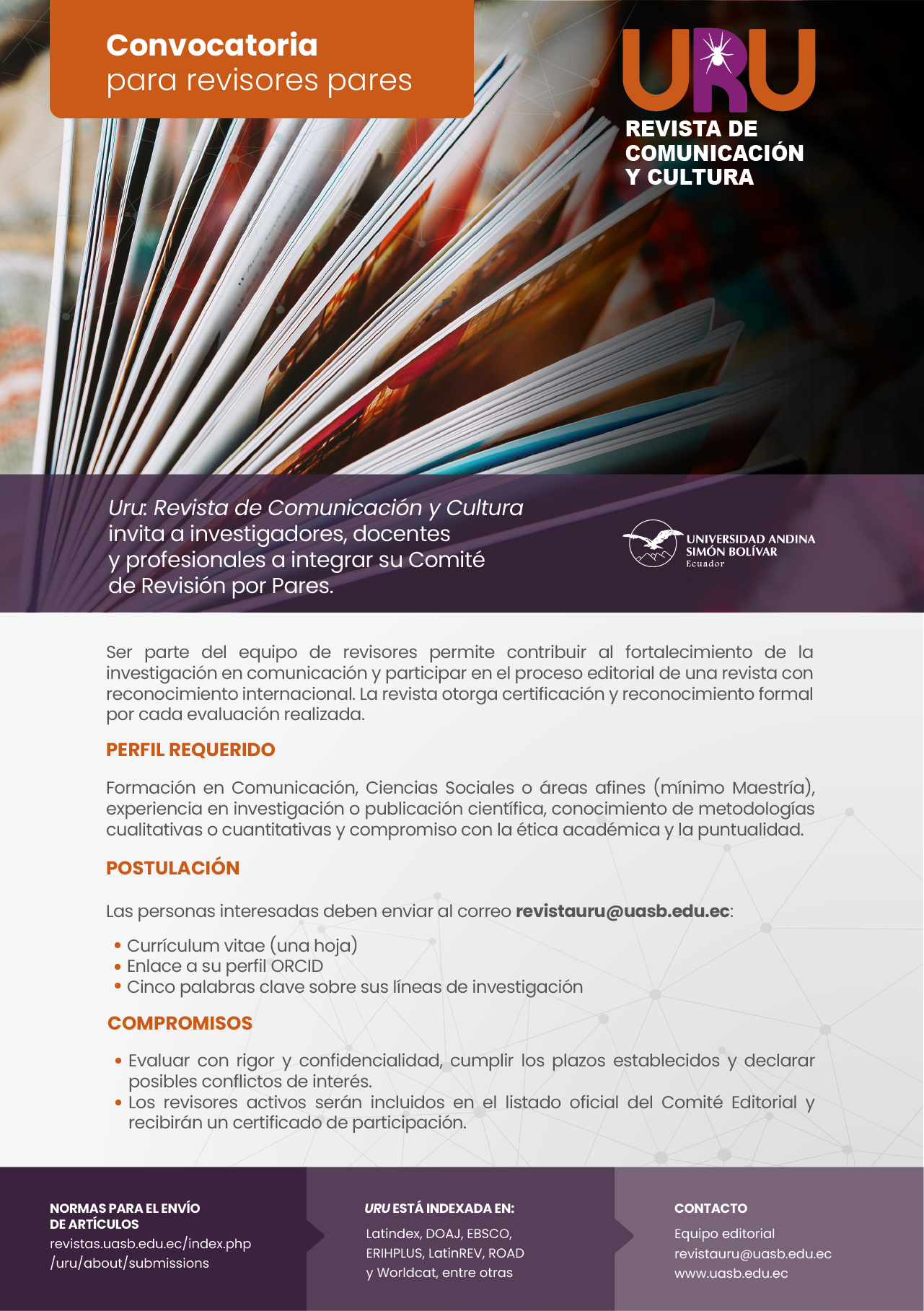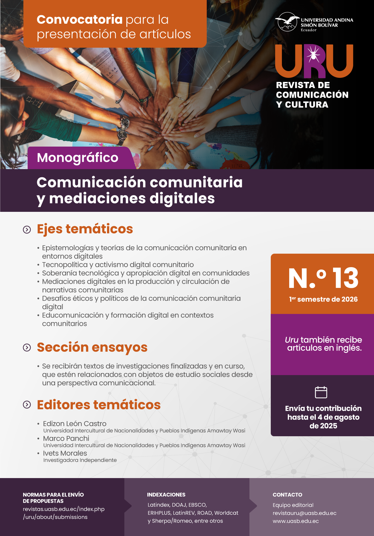 Uru: Revista de Comunicación y Cultura es una publicación académica digital, del Área de Comunicación de la Universidad Andina Simón Bolívar Sede Ecuador, con periodicidad anual.